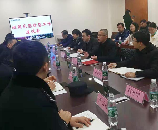 随后,在学生事务中心102会议室,公安机关与我校老师们共同开展了“校园反恐防恐工作座谈会”,交流反恐工作经验。强伟纲诚挚感谢公安机关对我校师生安全所做的保障与付出,向来宾们介绍了我校发展历程,并择要概括了我校反恐维稳工作的主要成果和未来努力方向。保卫处处长王振华详细汇报了我校在疫情防控安全、学生请假制度与宿舍安全管理、学生信息员制度等方面采取的安全管理措施。最后,施冬冬在总结发言中高度肯定了我校在反恐工作上的成绩,对我校与公安机关各部门的通力协作和积极配合表示感谢,对今后开展意识形态工作提出五点要求,一是强化落实领导责任制,二是健全学生日常管理制度,三是严格学生考勤管理,四是加强学生网络安全意识教育,五是强化《反恐怖主义法》等法治宣传,共同建设平安和谐的校园环境。
