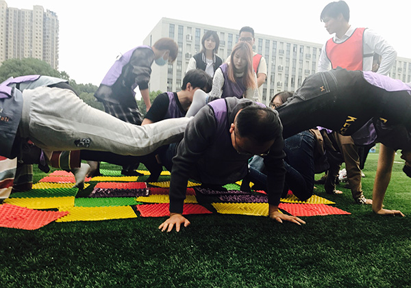 素质拓展分为准备活动、团辅活动、交流分享三个环节。在工作人员的带领下,同学们完成准备活动之后,展开了“前方有难后方支援”“千人过河”“指压板借力挑战赛”“撕名牌”四个团辅项目。“前方有难后方支援”环节主要考验同学们的反应能力和奉献精神,有助于增强团队凝聚力;“千人过河”主要考验同学们的团队协作能力及统筹安排技巧;“撕名牌”则展示出团队合作能力、协调能力、应变能力。