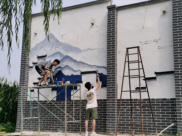 与此同时,志愿者们还结合专业特长,为路庄村绘制了独具乡村韵味的文化墙,为新农村建设添彩。志愿者们同村支书商定了绘制题材和图样,大家分工合作、不畏炎热,在村委会和篮球场的外墙上连续绘制3天,完成了以“社会主义新农村建设的总体要求”和“社会主义核心价值观”为主题的两幅文化墙绘,将艺术融入乡村生活,深受村民喜爱。