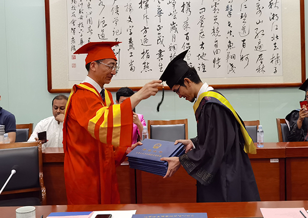 龚方红校长在毕业贺词中向2020届毕业生顺利完成学业表示祝贺,向身在海外的留学生同学表达了慰问,并鼓励同学们无论遇到何种困难都要乐观积极,用所学的知识与技能为自己国家的发展作出贡献,努力成为国际友好传播使者,促进中外文化交流。印尼特里萨克迪集团主席Bimo先生、印尼特里萨克迪旅游学院校长Fatty女士、印尼特里萨克迪物流交通大学副校长Juliater Simarmata先生分别代表海外合作高校对顺利完成学业的跨国分段联合培养本科毕业生表示祝贺,他们高度认可我校的外国留学生培养工作,并就进一步加深与我校稳固的合作表达了意愿。优秀毕业生代表、教师代表、家长代表表达了对母校、老师和同学们的不舍与感谢,龚方红校长身着学位服为毕业生代表行拨穗礼、颁发毕业证书、并合影留念。
