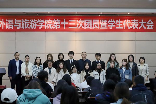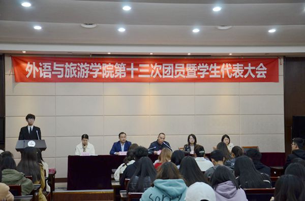 20191119日下午,外语与旅游学院第十三次团员代表暨学生代表大会在青春剧场隆重召开。外语与旅游学院党总支书记江铭、学工办主任周嫄以及院团总支负责老师及135名代表参加了大会。