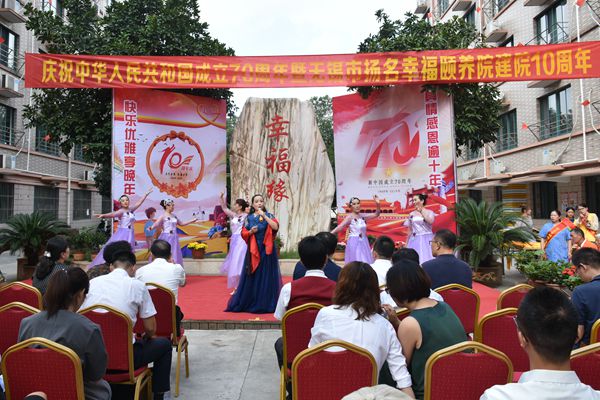 为协作组织好此次活动,我院志愿者早早到达活动现场,主动承担起迎宾、维持内场秩序、搀扶老人等工作。在庆祝活动中,颐养院工作人员和老人们表演了精彩纷呈的各类节目,如歌伴舞《我和我的祖国》、锡剧《祖国的好河山寸土不让》、广场舞“天美地美中国美”、大合唱、舞蹈等。在场的人们用热情的舞蹈与高昂的歌声为祖国庆生,为敬老院精彩十年喝彩。在庆典中,幸福颐养院还为包括我院在内的十余家合作单位赠送了锦旗,以表示多年来对颐养院养老事业关注和对老人的关爱。