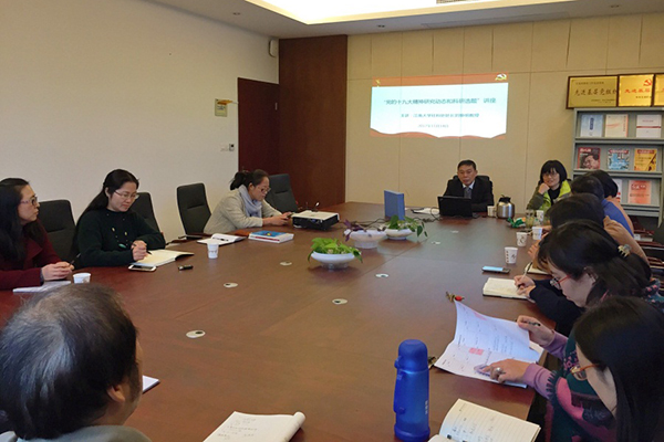 刘教授提出了研究十九大精神要注意“三个结合”,即注意结合地区实际、研究领域实际和个人认识实际。随后重点从“十个深刻领会”、党的建设、文化自信、社会治理等方面梳理了当前学术界对党的十九大精神的研究动态,并指出了科研选题的方向和技巧,使在座教师受益匪浅。