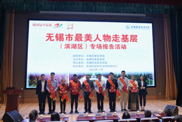 11月7日下午,无锡市最美人物走基层(滨湖区)专场报告会在我校举办,无锡市2021、2022年“最美人物”代表张旭羿、孙艳、朱兆国、查加福、苏颖与150多名师生分享了各自的故事,我校党委副书记杨雪琴,滨湖区委宣传部副部长、区文明办主任郑建峰等领导参加了活动。