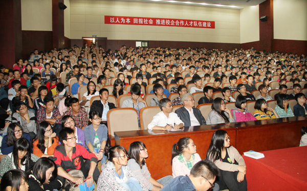 在我校深入开展党的群众路线教育实践活动之际,为提高同学们对革命传统的了解,加深对中国梦的认知,校关工委于10月15日下午邀请离休老干部、无锡市关工委报告团成员、无锡新四军历史研究会关工委主任吴成同志,在国际交流中心一楼报告厅做主题为“革命传统与中国梦”的报告会。会场内座无虚席,640余名同学挤满了整个报告厅的各个角落。