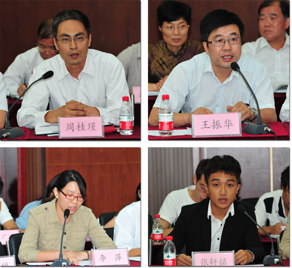 座谈会由校党委书记朱爱胜主持。会上,党委组织部部长王国忠首先代表群众路线教育实践活动领导小组宣布学校“干部廉政、教师廉教、学生廉学”行为规范,接着,副校长周桂瑾、基建办副主任王振华、物联网技术学院教师李萍、校学生会主席张轩铭,先后代表校领导、中层干部、教师、学生四个层面作了交流发言,并作出干部廉政、教师廉教、学生廉学的庄重承诺。