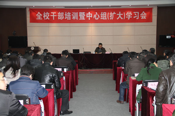 此次干部培训暨中心组(扩大)学习会以“迎接挑战,加快创新发展”为主题,党委书记朱爱胜在动员讲话中要求大家要充分认识加强和改进领导干部队伍水平的重要性,加强理论学习;要强化干部职能素质和执政能力的紧迫感和责任感,为学校的科学发展、创新发展、和谐发展谋求共识,增添动力,营造氛围。戴勇校长在讲话中要求广大干部结合学习内容深入思考,理论联系实际,解决现实工作中遇到的问题,切实提高自身素质,推动学校发展。