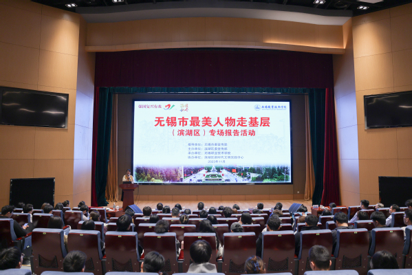 11月7日下午,无锡市最美人物走基层(滨湖区)专场报告会在我校举办,无锡市2021、2022年“最美人物”代表张旭羿、孙艳、朱兆国、查加福、苏颖与150多名师生分享了各自的故事,我校党委副书记杨雪琴,滨湖区委宣传部副部长、区文明办主任郑建峰等领导参加了活动。