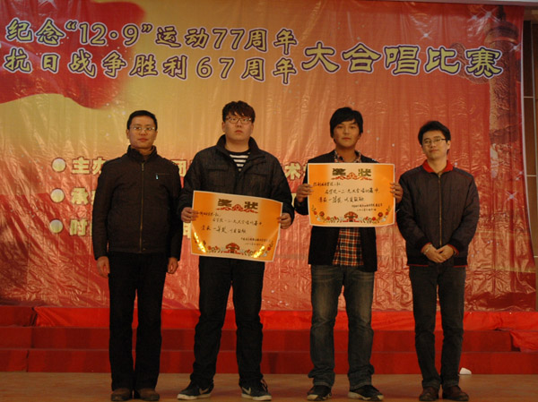 为纪念12·9学生爱国运动77周年、抗日战争胜利67周年,弘扬爱国主义光荣传统,营造良好的校园文化气氛,12月11日晚,由校团委主办、控制技术学院承办的大合唱比赛在大学生活动中心举行。校团委副书记谢欢、控制技术学院党总支副书记苗勇等嘉宾与1000多名师生共同观看了比赛,评委团由校团委和各院系分团委老师组成。