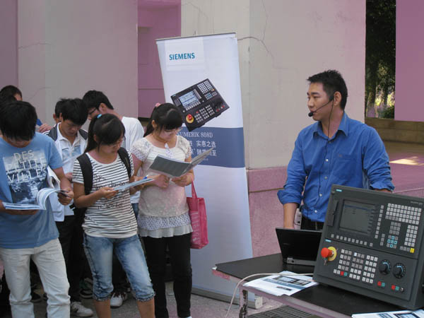 在技术讲演现场,数控设备专业近百名同学利用课余时间参加了新技术讲演,巡展车上配置了西门子专门针对数控系统市场推出的SINUMERIK 808D系统及828D Basic数控系统。同学们兴趣浓厚,一个个依次动手调试了新系统,尝试设置机床参数等。(徐安林)