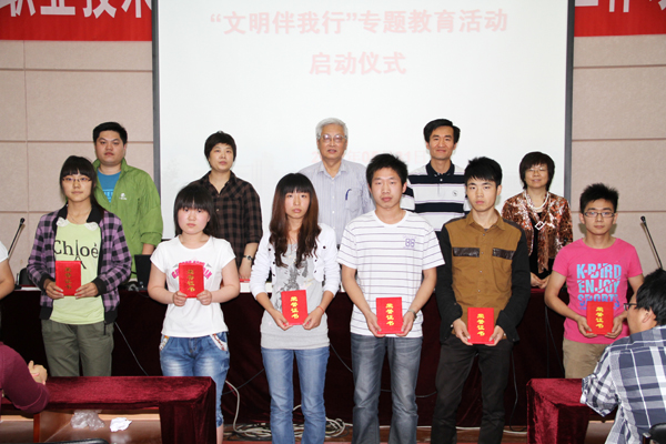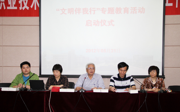 赵凤升主持启动仪式 ,会上表彰了2011年读书征文活动获奖者,学生处副处长吴斌宣读了《关于开展“文明伴我行”专题教育活动的通知》,与会领导向一年级辅导员和学生社团分别赠送了《传承文明 健康成长》、《拥抱文明 幸福成长》丛书。