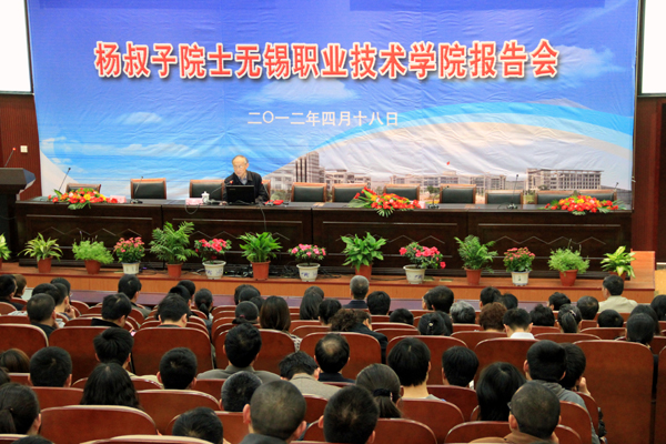 在下午的《教育:以文“化”人》讲座开讲前,杨叔子院士高兴地接受了我校的聘书。然后作为客座教授,向500多名师生畅谈了他的教育思想。他强调,文化就是人化,把野蛮人变成文明人,把低级文明人变成高级文明人。教育的主要形式与手段是以文“化”人,教育的根本目的与宗旨是提高国民素质。文化具有类型整体性和内涵整体性,类型整体性分为科学文化和人文文化,科学文化是“立世之基”、人文文化是“为人之本”,二者同源共生,互异互补,交融同求;教育要把“科学和人文”有机结合,培养素质全面的人才。内涵整体性分为知识、思维、方法、原则、精神,其中知识是基础,思维是关键,方法是根本,原则是精髓,精神是灵魂。高职教育培养的是职业人,而不是职业机器,要以文化内涵整体育人,以文化类型整体育人,不仅要培养学生的动手能力和创新精神,更要培养学生对国家、对民族负责的社会责任感。两个多小时的精彩讲座和精辟答问,赢得了师生的热烈掌声。