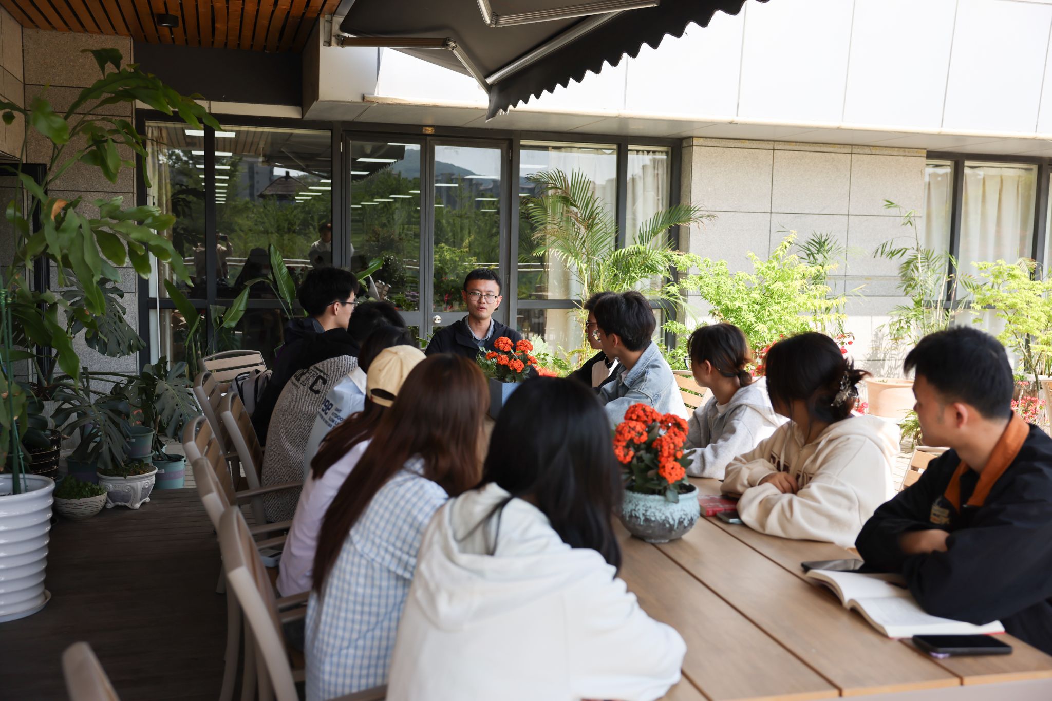 “书馆游园会”社团展示体验活动在一楼大厅和二楼中庭热闹开展,现场人头攒动,气氛热烈。书法艺术、棋类游戏、非遗卡纸彩色刮画、影谜猜猜乐等社团展示活动吸引了众多读者的参与。在图书馆惜花园,校团委举办的“书香蠡溪 阅享未来”青春荐读会,为青春学子提供了一个分享心得、交流感悟的平台。