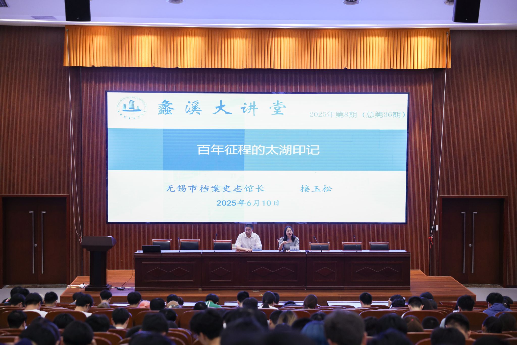 为引导青年大学生忆初心、悟初心、践初心,赓续红色血脉,从党史中汲取奋进力量。6月10日下午,学校邀请无锡市档案史志馆馆长、党组书记,全市“三精三名”党课名师接玉松作题为《百年征程的太湖印记》专题报告。报告会由党委副书记杨雪琴主持。