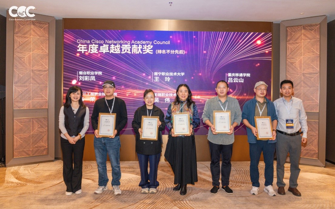11月14日至16日,2025年度思科网院教师论坛暨第十九届理事大会在南宁召开。本次论坛以“匠心育才·聚启生态·智赢未来”为主题,汇聚思科大中华区资深副总裁兼首席技术官侯胜利、公共事业部全体成员、中国思科理事会成员,以及来自全国本科与职业院校的近百名专家学者与网络专业骨干教师。我校凭借在校企合作与人才培养方面的突出表现,荣获“年度典范网院(职业院校)”称号,教务处吴伟老师、物联网工程学院肖颖老师分别获评“年度卓越贡献奖”。