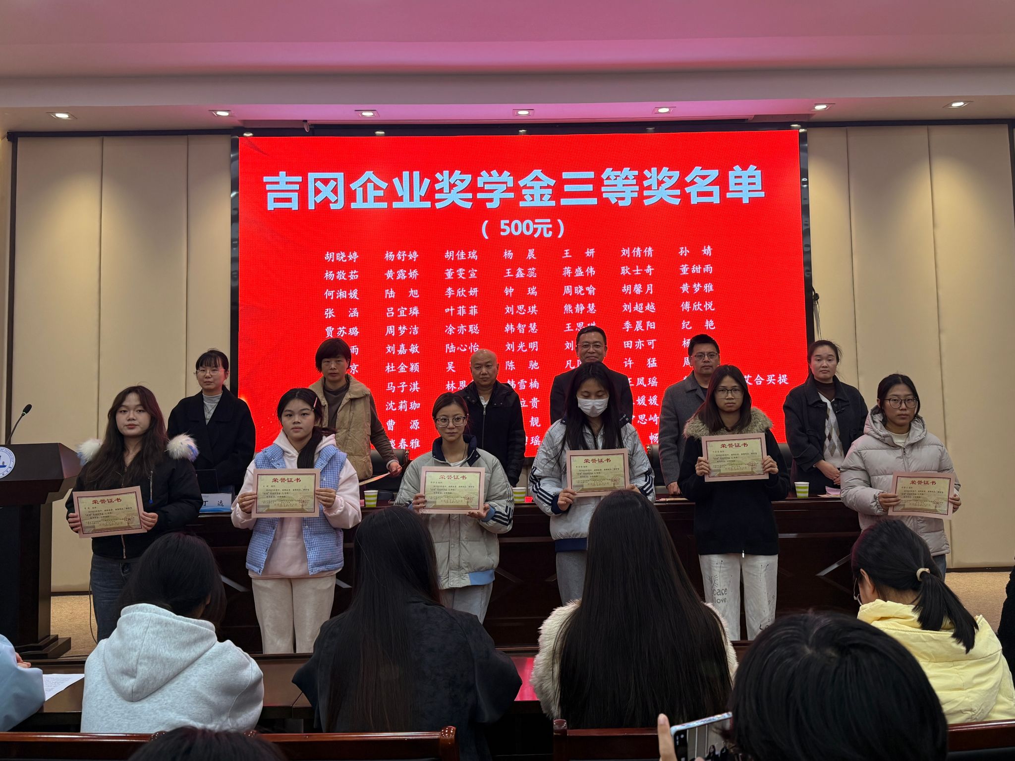 仪式伊始,吴乃鑫发表欢迎辞,对长期以来关心支持学校及学院人才培养工作的吉冈公司表示诚挚感谢,对获奖同学表示热烈祝贺。徐悦宣读表彰决定,全校共128名来自不同专业的优秀学子获奖,号召学子们以受表彰同学为榜样,积极向上、刻苦学习。随后,与会领导及企业嘉宾为获奖学生依次颁奖。文旅学院智旅24321班张凤妍同学作为获奖学生代表发言,分享了自己的学习心得与实践经历,表示将牢记学校与企业的殷切期望,珍惜荣誉、心怀感恩,努力成长为能服务地方产业发展的高素质技术技能人才。