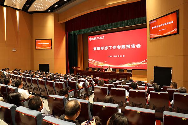 为深入学习贯彻习近平总书记关于意识形态工作的重要论述,进一步做好新时代高校意识形态工作, 9月29日下午,学校在综合楼一楼报告厅举行意识形态工作专题报告会。常州大学人文社科处处长、周有光文学院院长葛彦东教授应邀作《新时代高校意识形态工作的责任与使命》专题报告,党委理论学习中心组成员、中层干部、辅导员、校网络评论员参会,会议由校党委副书记周桂瑾主持。
