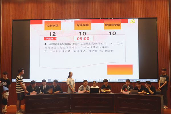 现场共有各二级学院经初赛选拔产生的9支队伍共27名选手参赛,马克思主义学院直属党支部书记赵后起、宣传部副部长魏艳、校团委副书记郑月圆及各分院分团委书记出席了活动。竞赛内容涉及党的发展历程、党的伟大成就、党的理论知识等内容,既有对百年党史的回顾,也有对辉煌成就的梳理。现场设有必答题、抢答题和风险题三种题型,经过紧张激烈的角逐,最终外语与旅游学院、物联网技术学院、爱尔兰学院代表队胜出,获得比赛的冠亚季军。