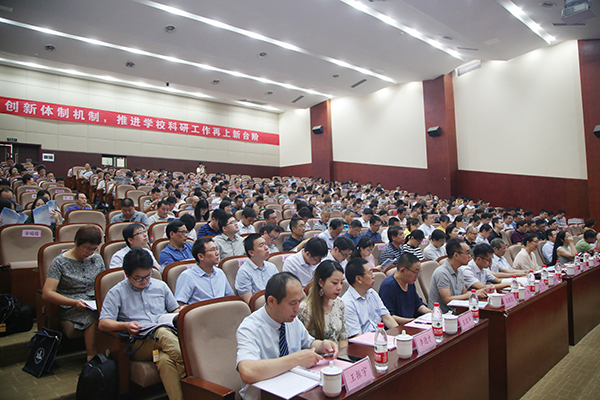 随后,龚方红校长作了题为《强基础 建机制 上台阶 推进学校科技工作高质量发展》的科研工作报告,回顾了我校两年来在科研工作方面取得的成绩,对科研工作中存在的五个不适用进行了分析,明确了今后两年的工作任务与目标。龚方红校长要求大家抢抓机遇、开拓创新、扎实工作,为学校科技进步做贡献。科技产业处刘全胜处长围绕科技工作做题为《深化科技创新机制体制改革,推进学校千万级研究所建设》的介绍,对学校今年来的科技工作进行了回顾;分析了学校科技工作存在的不足与瓶颈问题;介绍了科技工作在体制机制创新方面的新举措;重点介绍了将要展开的千万级研究所建设相关事宜。智能制造中心2.0项目总设计刘志刚副教授介绍了智能制造中心建成以来取得的成就和积累的经验,并介绍了即将展开建设的2.0项目总体方案。