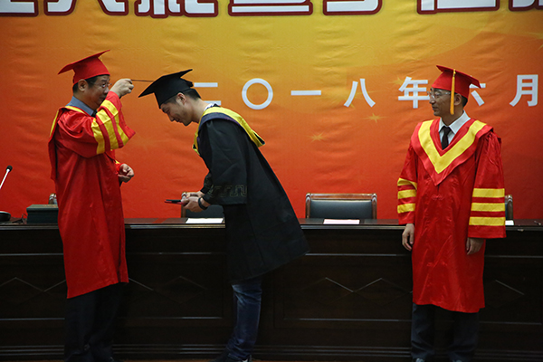 随后,全体2018届本科毕业生依次上台,从龚方红校长和梅强副校长手中领取毕业证书和学位证书,梅强副校长为每一位毕业生行拨穗礼。