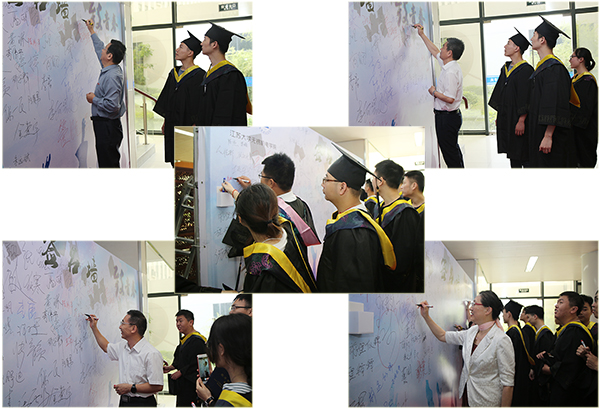 校领导与毕业生在签名墙上留言