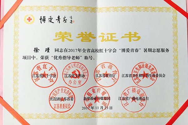 会上通报了江苏省第五批红十字示范学校评选结果,我校从全省参与申报的近百所学校中脱颖而出,成为本批次无锡市唯一获此殊荣的高校。无锡市红十字会对我校进行了表彰授牌。会议还对2017年全省高校红十字会“博爱青春”暑期志愿服务项目进行了表彰,我校物联网学院徐瑾老师获评“优秀指导老师”。