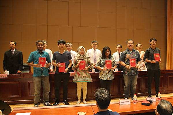 开学典礼上还对品学兼优的留学生进行了表彰,顾京副校长宣读了表彰决定,全体校领导为留学生颁发获奖证书及奖学金。2015级陈文殊同学参加“同乐江苏”外国人汉语演讲比赛获得苏南赛区三等奖,朱爱胜书记为其颁发特殊贡献奖,老生们的优秀表现为新生树立了良好的榜样。
