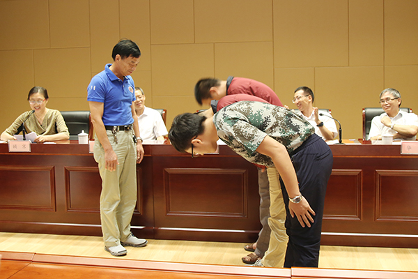 当天的表彰大会上,还举行了一个简单而隆重的收徒仪式,我校特聘兼职教授、中船重工七〇二所蛟龙号载人潜水艇首席装配钳工技师顾秋亮正式将两位专业教师和一名学生收为徒弟,并以自己的座右铭谆谆教诲:“我的工作无差错,我的岗位请放心!”