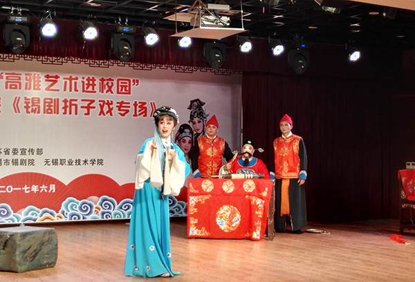 锡剧是以无锡地名命名、用无锡方言演唱的深受无锡老百姓喜爱的优秀地方戏曲,它和阿炳的《二泉映月》以及钱钟书、东林书院一样,是无锡重要的文化名片。当晚,包含多位国家一级演员在内的市锡剧院的10余位艺术家们为我校师生奉献了《孟姜女》、《玉蜻蜓》、《青丝泪》和《宝莲灯》四出经典折子戏,艺术家们深厚的表演功力和精湛的技艺将传统的戏曲故事和道德大义演绎地丝丝入扣又荡气回肠,赢得了全场师生的热烈赞誉。