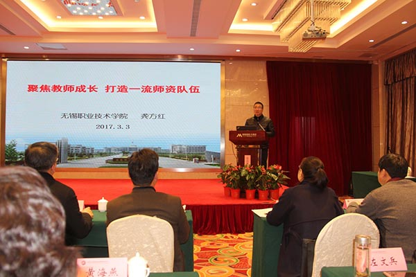 会议由江苏省教育厅师资处处长崔春霞主持。省高等职业教育教师培训中心主任王斌总结了2016年全省高职院校教师培训工作,部署了2017年全省高职院校教师培训工作。国家教育行政学院职业教育研究中心主任邢晖做了题为《高职院校教师队伍建设面临的机遇与挑战》的专题报告。包括我校在内的两所学校作了师资队伍建设工作的交流报告;三所学校做了关于培训工作的交流报告。
