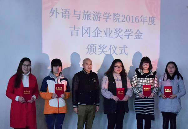 颁奖仪式由外语与旅游学院院长助理梁峰主持。王占东书记首先代表学院对参加本次颁奖仪式的领导和嘉宾表示欢迎,并对获得企业奖学金的同学表示祝贺。无锡吉冈精密科技股份有限公司周延总经理向同学介绍了吉冈公司最新发展的情况,谈及设立企业奖学金的目的,他给获奖同学送上殷切寄语,他希望奖学金能帮助家庭困难的优秀同学更好地学习,并鼓励更多的学生加强实践锻炼,掌握知识本领,报效祖国,回报社会。在冷静老师宣读完本次“吉冈企业奖学金”获奖同学表彰决定之后,在激昂的进行曲伴奏下,35名获奖同学分批走上台来,从周延总经理、冯渊副校长以及学院领导手中接过获奖证书,并一起合影留念。
