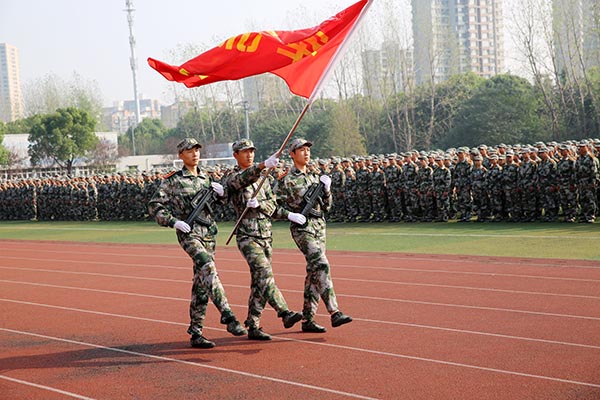 随后,校党委副书记谈向群宣读了表彰决定,2016级新生中共有175名同学在军训期间表现出色,获评优秀学员称号;党委书记朱爱胜代表学校向承训部队、人民解放军71031部队赠送锦旗。