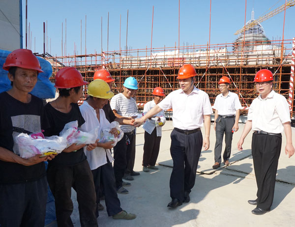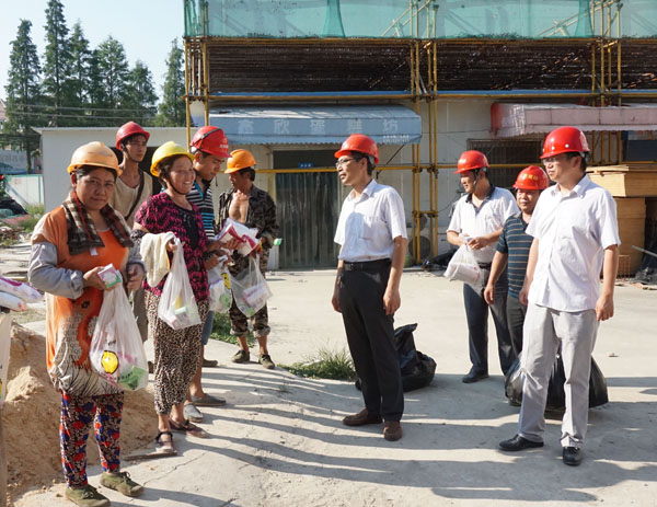 校领导一行还慰问了奋战在施工一线的建筑工人,表扬了他们吃苦耐劳的干劲,鼓励他们在确保安全的前提下继续发扬不怕苦不怕累的精神。施工单位负责人在感谢领导关怀的同时也表示,一定严格遵守施工规范和设计要求,克服不利因素,保质保量按期完工。