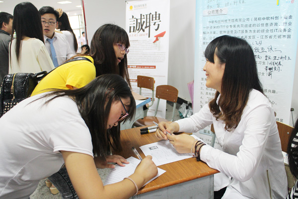 6月16日下午,由校学生处主办,百度人力资源公司共同举办的2015年毕业季双选会暨暑期实习招聘会在我校太湖校区J3大厅举行。双选会吸引了中软科创科技无锡有限公司、中国航天科技集团公司、无锡汉爵投资有限公司白金汉爵大酒店、中航工业航空动力控制系统研究所(614所) 等85家用人单位来校招聘,提供包括操作、技术、管理、人事、营销、电子商务、模具设计与制作、机械工程、汽车维修和服务等1000多个就业和实习实践岗位。