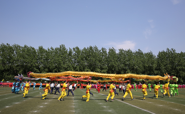 启动仪式由市体育局副局长汪克强主持,在简短的领导致辞后,表演正式开始。首先登场的是由我校2000名学生组成的“健身气功·六字诀”表演,每名学生都身着统一白色服装,随着音乐进行健身气功展示,现场十分壮观,引来观众阵阵掌声。随后是我校舞龙队的表演,以及千人广场舞和易筋经、五禽戏、八段锦、太极拳等群众项目展演等。