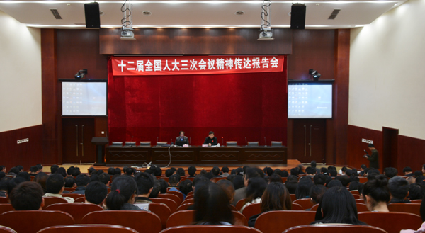 金征宇代表首先从大会意义、大会议程、政府工作报告、人大常委会工作报告、立法法修改说明、“两高”工作报告和江苏代表团审议等方面传达了十二届全国人大三次会议精神。并用图片展示了大会现场和李克强总理参加江苏代表团审议及与他亲切握手的情景,还传达了李克强总理对江苏在发展升级上走在全国前列的三点要求:一要通过改革开放率先在经济发展新常态下打造发展新动能;二要带头释放创新驱动新红利;三要在长江经济带发展中起引领作用。接着,他重点解读了政府工作报告的10个关键数据和11项新承诺,以及立法法修改中与人民群众相关的税收法定、地方规章等问题。并归纳了今年两会的10个热点关键词:改革、反腐、新常态、依法治国、一带一路、环保、城镇化、养老金改革、创业和价格改革,同时介绍了清新的会风,与大家分享了参加大会的感受。一个半小时的传达报告,最后在全校与会师生员工的热烈掌声中结束。