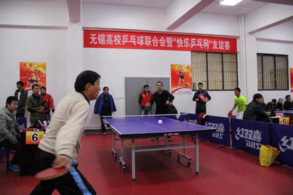 12月13日下午,无锡市高校乒乓球联合会(以下简称高乒联)成立大会暨“快乐乒乓网”友谊赛在我校体育馆举行。无锡市原副市长吴建选、教育局副局长符菊成、体育局副局长汪克强、市乒乓球协会主席张健、市乒乓球总教练惠钧,我校党委书记朱爱胜、副书记谈向群以及来自全市15所高校的领导、嘉宾等100多人出席成立大会。