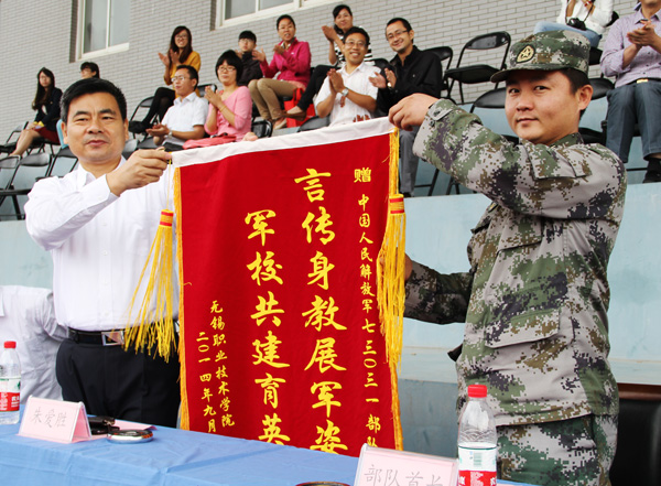 校党委副书记谈向群宣读了《关于表彰2014级学生军训先进单位和先进个人的决定》,16个连队和161名优秀学兵获表彰,校领导和部队首长向先进连队和个人颁发了奖状;校党委书记朱爱胜向承担我校军训任务的人民解放军部队赠送锦旗。副校长华坚对今年的军训工作进行了全面总结,代表学校向承担承训部队全体教官表示衷心的感谢和崇高的敬意,向圆满完成军训任务的全体新同学表示慰问和祝贺,并要求同学们将军训的收获和成果巩固下来,贯穿到今后的学习和生活中,努力把自己培养成全面发展的高素质人才。(魏艳 王卫东 高凤)