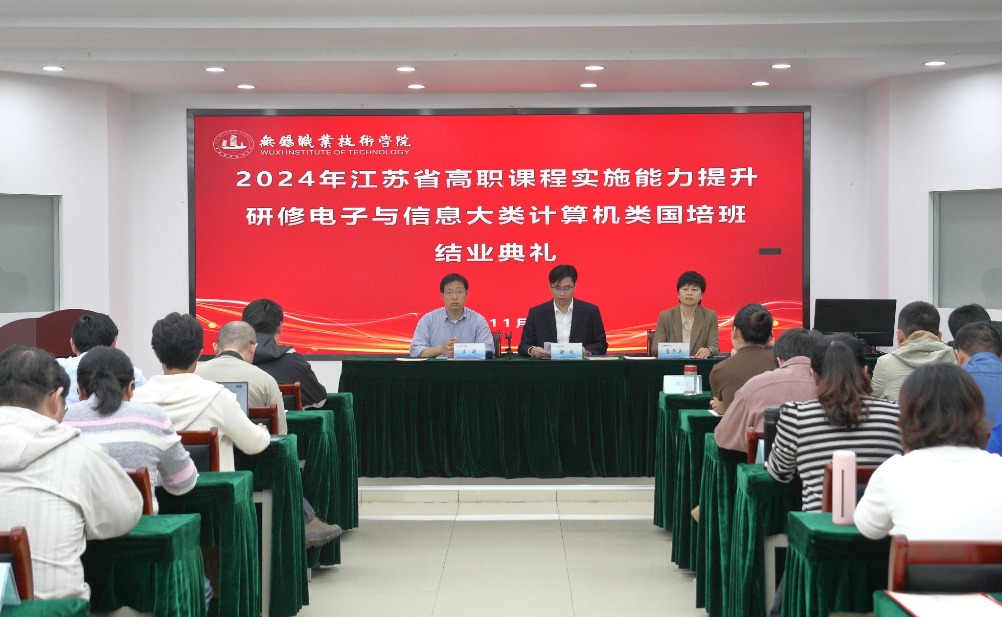 11月15日,由物联网工程学院承办的江苏省高职课程实施能力提升研修班(电子与信息大类计算机类国培班)经过为期4周的紧张学习,完成各项培训任务,顺利结业。结业典礼在图C-401举行,物联网学院、继续教育与培训部相关负责人,全体学员及培训班工作人员参加结业典礼。