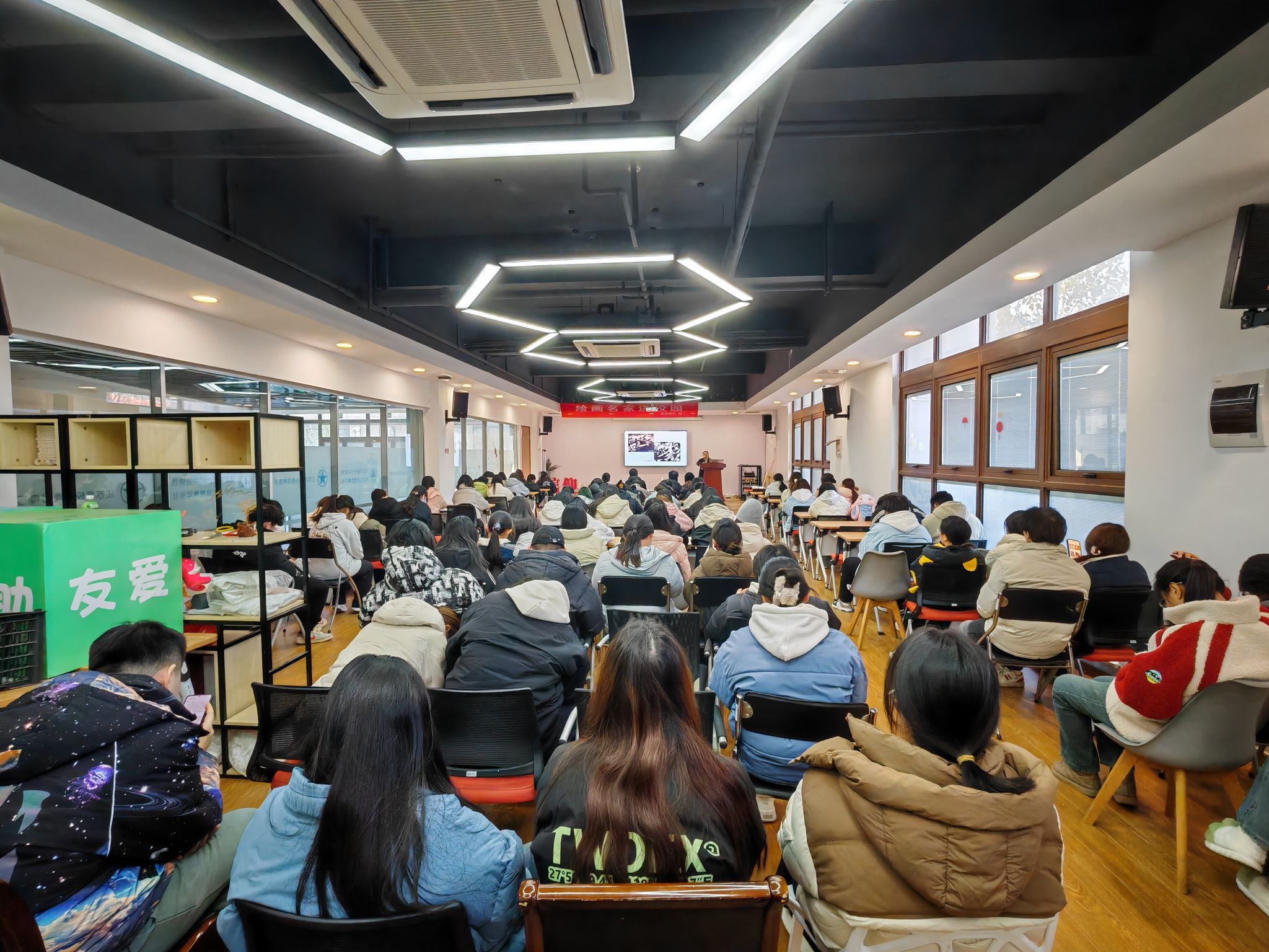 12月17日下午,校团委在大学生事务中心青智库举办“书画名家进校园”主题活动,本次活动邀请中国美术家协会会员、江苏省美术馆专职画家陶缀教授与我校师生交流。我校团委书记郑月圆、蠡溪画社指导教师和百余名师生绘画爱好者参加了本次活动。