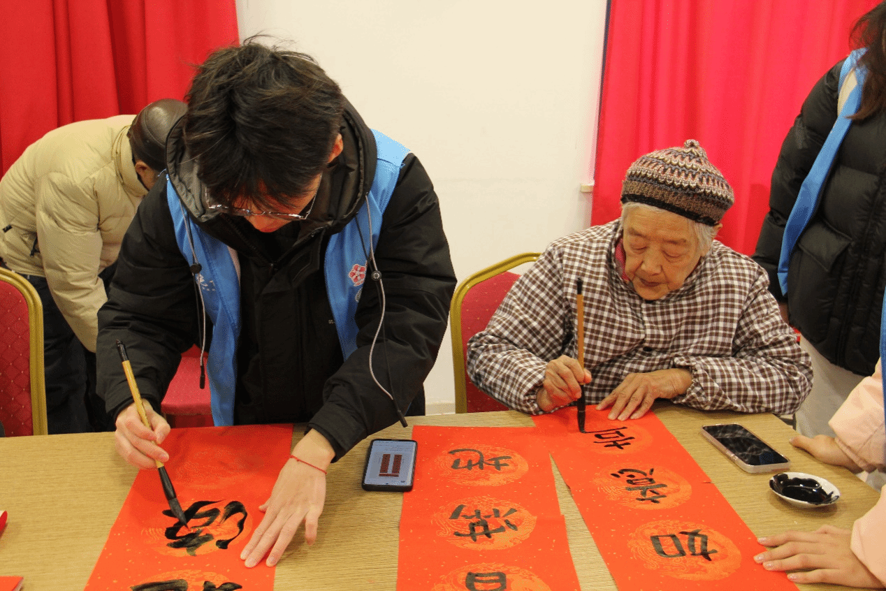 表演结束后,志愿者们通过制作春联和漆扇,与老人们一同挥毫泼墨,绘扇寄情。春联上,一笔一划书写的是对新年的美好祈愿,也是对祖国 75 周年辉煌成就的歌颂,字里行间洋溢着浓浓的年味与深深的家国情怀。非遗漆扇轻摇,老人们与志愿者共同绘制的不仅是精美的图案,更是在描绘祖国山河的壮丽多彩,在扇面展开的方寸之间,展现出岁月静好中对传统文化的传承与对伟大祖国的热爱,让老人们在艺术创作中感受欢乐温馨,共迎盛世新篇。