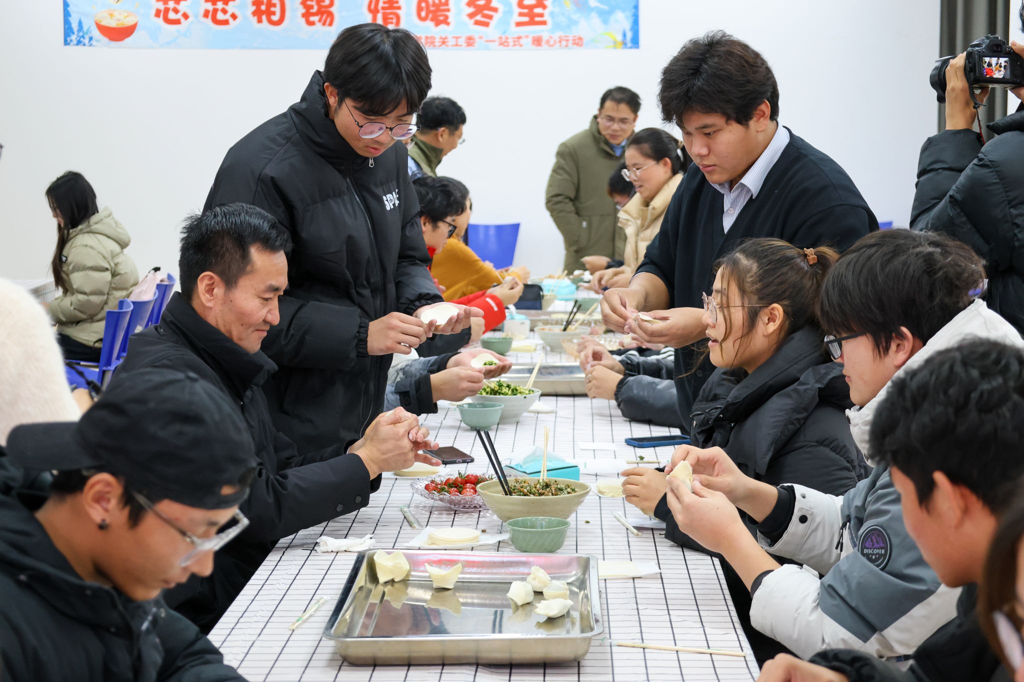 揉面、擀饺子皮、拌馅,活动现场俨然成了“欢乐大厨房”。参与包饺子的师生分工协作,有些同学是包饺子的“老手”,手法娴熟,包出的饺子形状精美,而有些同学则是初次尝试,虽然包出的饺子形状各异,但充满了创意,活动现场充满了欢声笑语。热腾腾的新鲜饺子出锅后,大家围坐在一起,品尝着香气四溢、汤汁鲜美的饺子,畅聊大学生活,气氛温馨而热烈。