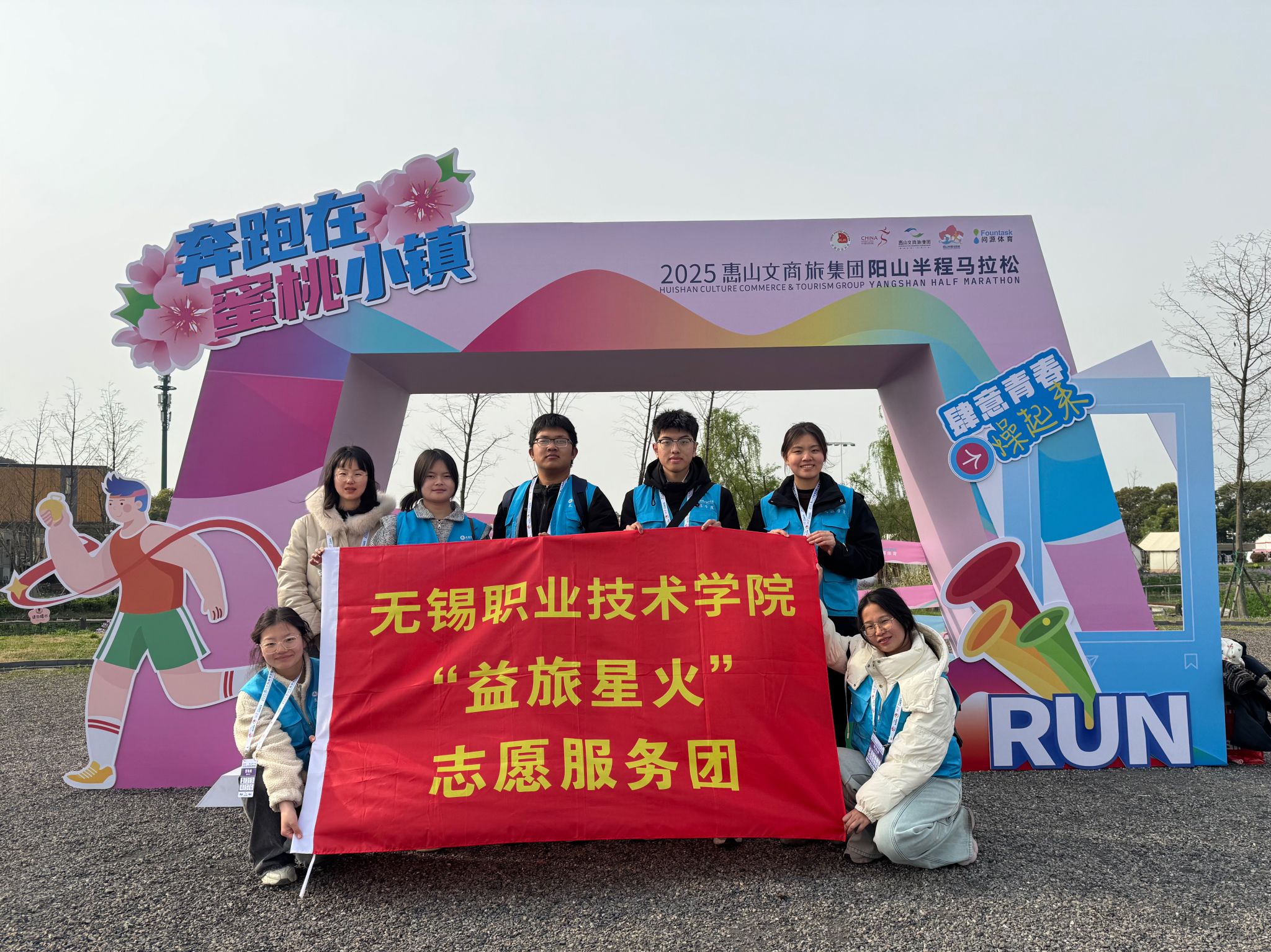 3月30日上午,2025惠山文商旅集团阳山半程马拉松在阳山镇正式开赛。赛事设置半程马拉松、欢乐跑两大项目,吸引多年龄段跑者参与。文旅学院党总支副书记丁远带领益旅星火志愿服务团6名学生参与赛事志愿服务,为赛事提供后勤保障与摄影服务等工作。我校顾秋亮创新班学生王珂作为参赛者登上半程马拉松赛道,展现青春风采。
