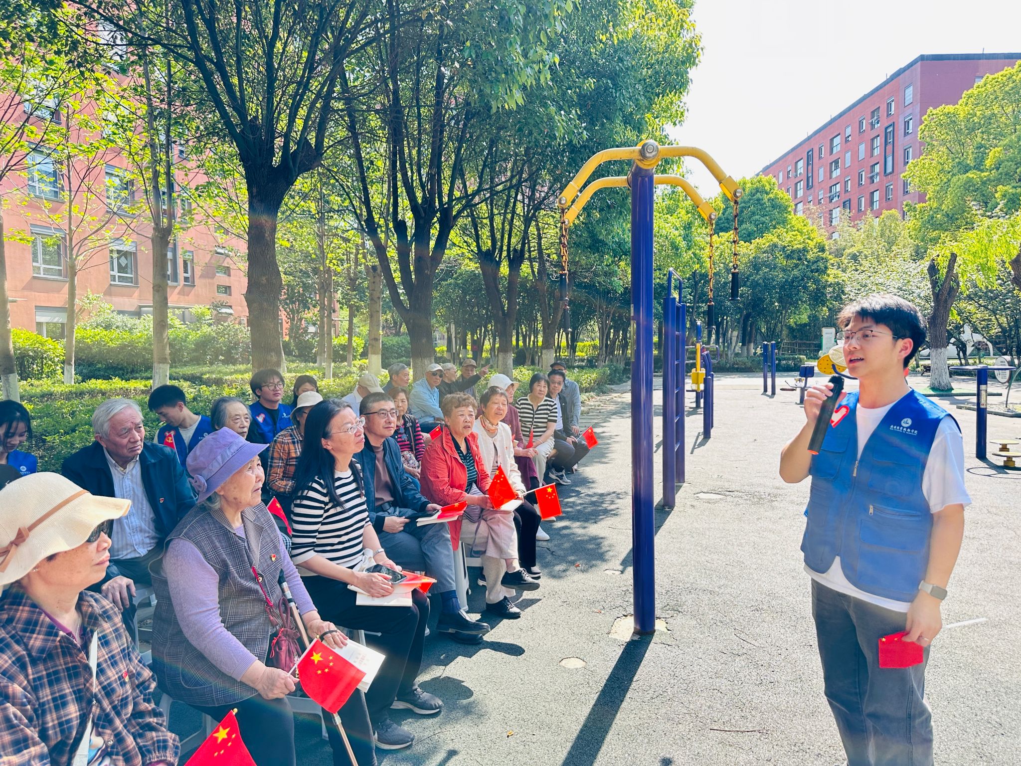 “没有共产党就没有新中国……”在社区老党员徐红星和控制工程学院陆金子同学的领唱下,全场齐声高歌,激昂旋律将红色信仰深植人心。徐红星动情阐释:“红歌是穿越时空的精神火炬,激励我们永葆为民服务的赤子之心!”