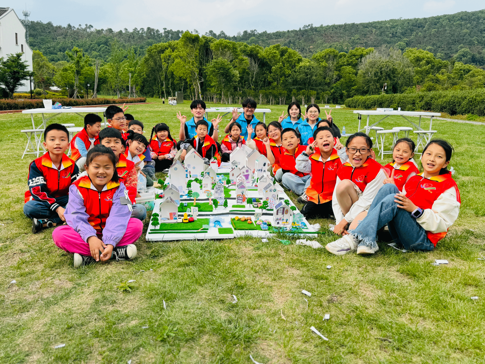 在实践环节中,志愿者们以“传统与现代共生”为理念,指导孩子们完成中湾村微缩景观模型的沉浸式建构。从传统砖瓦榫卯工艺的还原,到光伏板与生态沟渠的智能化集成,志愿者通过草图绘制与实体搭建的递进式探索,将绿色理念与创新逻辑融入乡村场景构建之中,培养了孩子们的创新思维与动手能力,又让乡村文化与生态智慧得以生动传承。