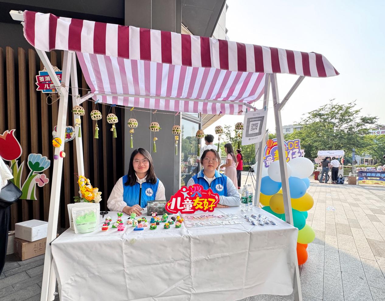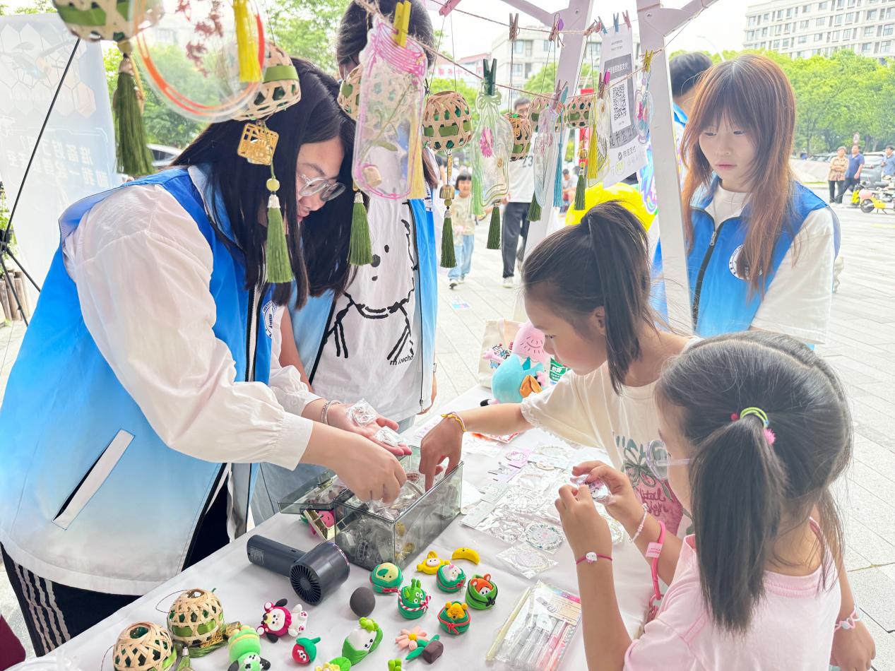 值得一提的是,此次爱心市集中,学院“悦享她力量”手作疗愈所带来的手作作品更是成为全场焦点,手串、黏土摆件、香囊等深受小朋友们的喜爱。同学们化身“金牌销售员”,热情满满地招揽着小顾客,她们有的拿着商品向路过的小朋友展示,认真介绍手工品的特点;有的推出了“买一送一”的优惠活动,引得小朋友们竞相驻足选购,好不热闹。手作疗愈所负责人金梁琪同学表示,将自己做的作品义卖帮助有需要的人,是一件十分有意义的事情。后面,“悦享她力量”手作疗愈所将会将义卖筹集的善款对接社区专项行动,更好地传递了爱心与温暖。