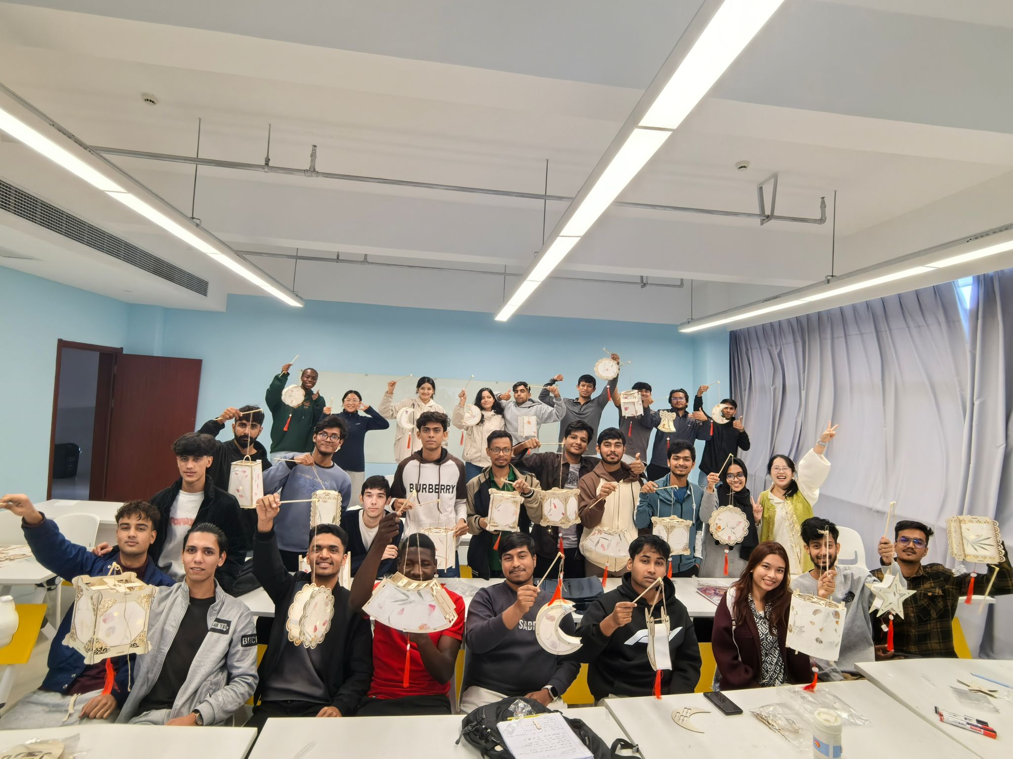 活动在轻柔的中国传统音乐中拉开帷幕。破冰环节的“光影接龙”迅速拉近了彼此距离。在了解灯笼承载的“团圆与希望”文化寓意后,同学们在老师的引导下进入专注的创作阶段。裁剪宣纸、描绘图案、组装灯架,指尖的细致操作成为凝聚注意力的“正念练习”。随着一盏盏独具特色的灯笼渐次成型,活动迎来了最动人的“点亮仪式”——室内灯光暗下,四十盏手工灯笼同时亮起,温暖的光芒瞬间照亮了整个空间,也映照出同学们惊喜与感动的脸庞。在随后的分享中,巴基斯坦学生艾哈迈德动情地说:“这盏灯让我想起了家乡的节日,虽然远离家人,但在这里我感受到了同样的温暖。”杨意健同学则表示:“教国际同学做灯笼的过程,让我对传统文化有了新的理解。”