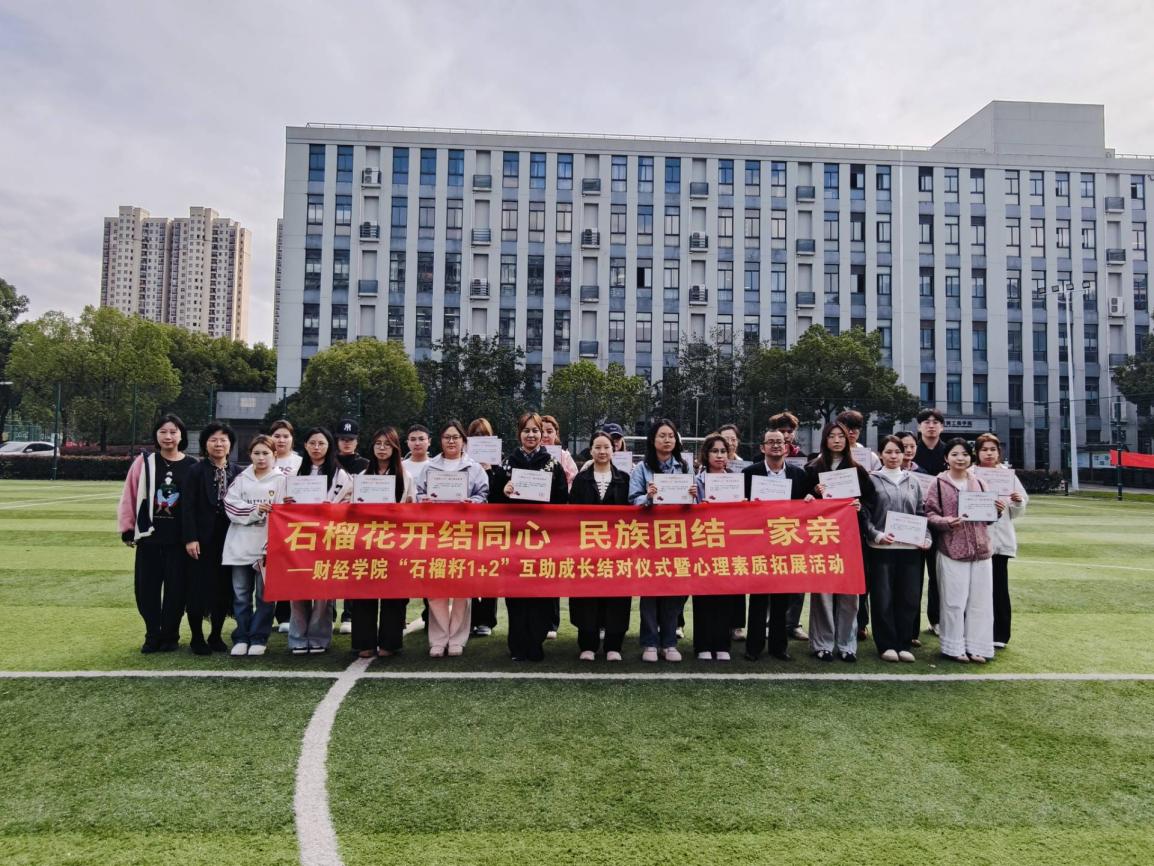 为深入贯彻落实中央民族工作会议精神,有形有感有效推进铸牢中华民族共同体意识教育,11月11日下午,财经学院以“石榴花开结同心,民族团结一家亲”为主题,在牡丹园前足球场组织开展“石榴籽1+2”互助成长结对仪式暨心理素质拓展活动,分院党总支书记徐瑾,学工办、分团委相关老师以及参与互助成长计划新结对的师生共计30余人参加活动。