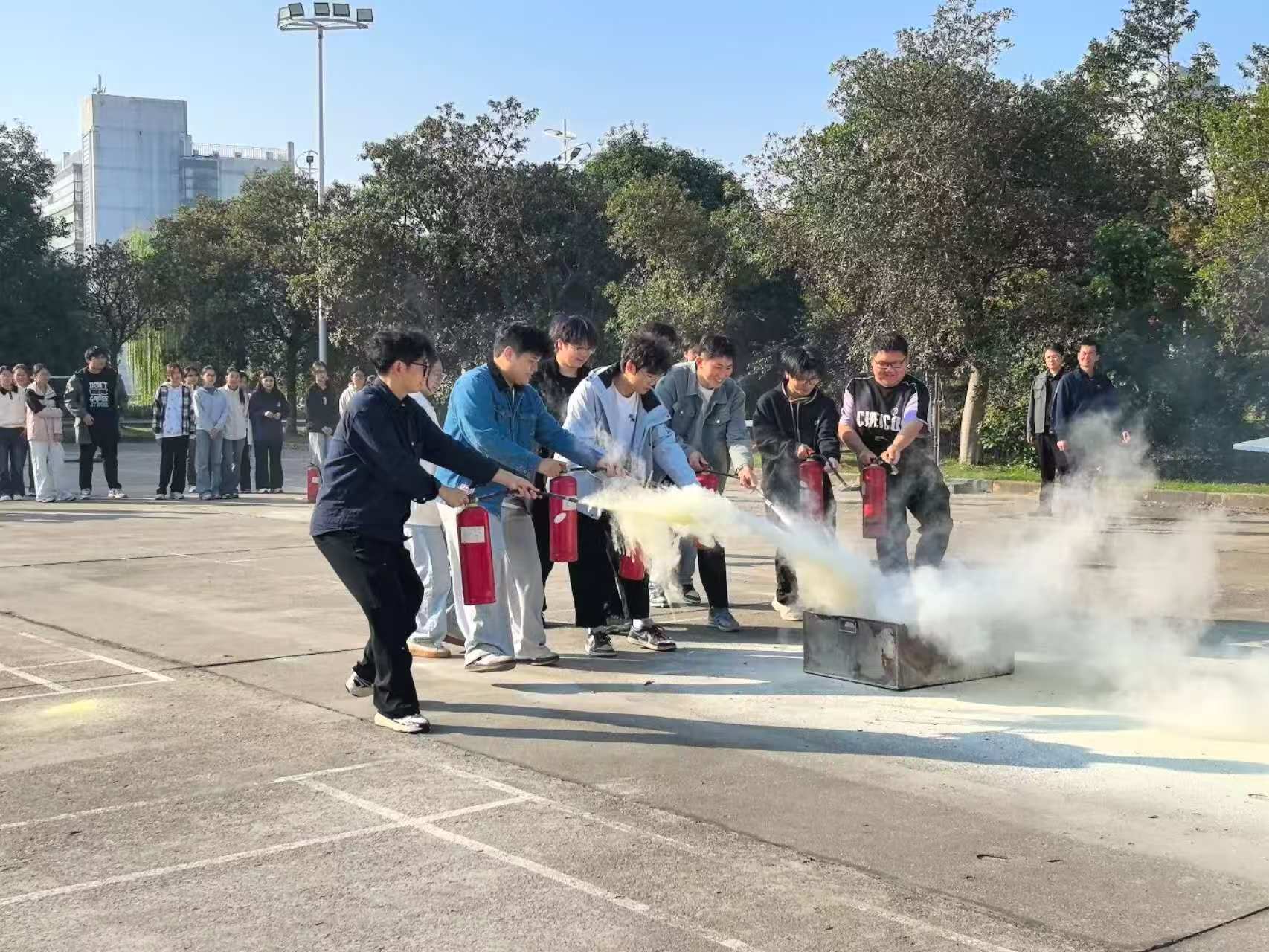 在随后的实操演练环节,师生们移步至指定空旷场地。保卫处专业指导老师现场演示干粉灭火器的规范使用步骤,即“提瓶、拔销、握管、压柄”四字诀,并讲解了操作要领。紧接着完整展示了消防栓的水带快速连接、阀门准确开启、水枪有效瞄准等一系列动作。在认真观摩后,全体参训师生分组依次上前,进行灭火器扑救初起火灾和消防栓出水操作的实战演练。