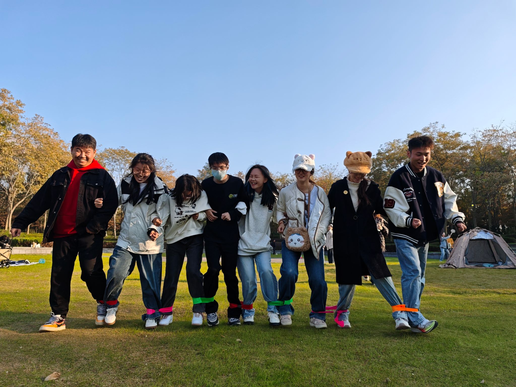 活动伊始,“组硬币”的暖场活动中,成员化身不同“面值”的“移动硬币”,根据报出的金额,迅速寻找队友组成对应总额。让师生在破冰游戏中快速拉近距离。团队竞赛环节包含了“抗战精神主题竞答”“反应大挑战”“八人九足”“你说我猜”四个精心设计的主题活动,分别设置在了长广溪湿地公园的四个打卡点。竞答环节中,大家沉着应答,在党史知识的比拼中厚植爱国情怀;反应挑战里,趣味绕口令引发阵阵欢笑,有效活跃了现场氛围;“八人九足” 考验着团队的协同默契,队员们齐声喊着口号稳步前行,摔倒了便迅速起身,尽显青春韧劲;“你说我猜” 则让大家在肢体表达与语言理解的碰撞中,加深了彼此的默契。